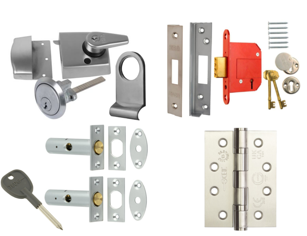 - These oak double doors are fitted as standard with a night latch and a BS3621 insurance-approved 5-lever deadlock, six 4" heavy-duty Grade 13 stainless steel hinges, draught seals fitted into the frame, and an aluminium (or brass) cill threshold.