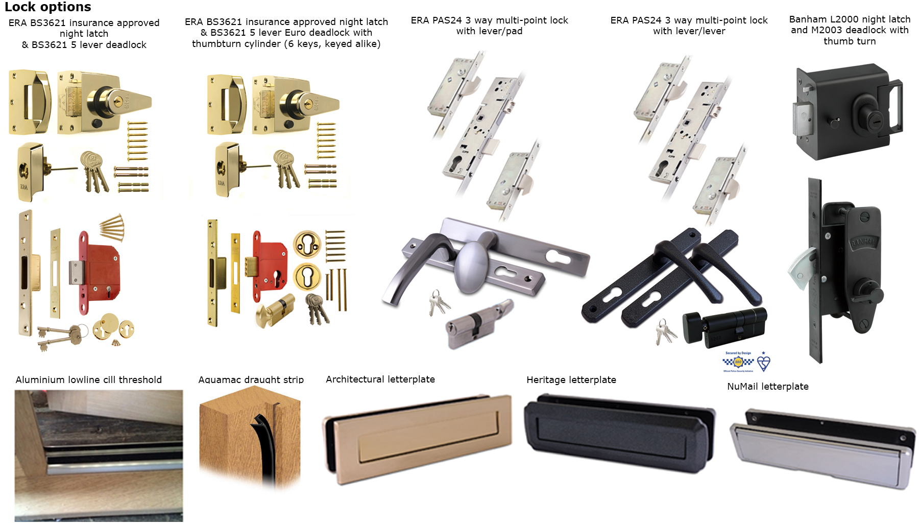 - 1. ERA BS3621 insurance approved night latch (with 3 keys) and BS3621 5 lever deadlock (with 2 keys)