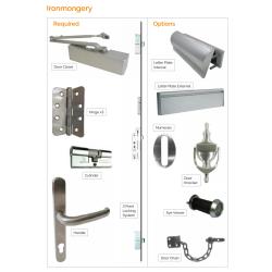 IRONMONGERY Hinges: 3no Grade 13 Ball Bearing Hinges Door Closer: Face mounted, overhead door closer Lock: ‘Crimebeater’ 3 point locking system Cylinder: 3 Star Kitemarked Euro Cylinder with thumb turn Handle: EA compliant Lever Handle