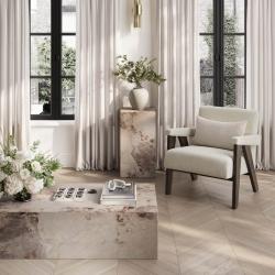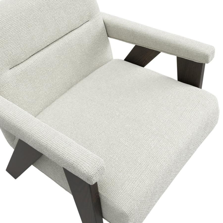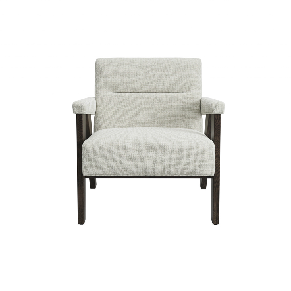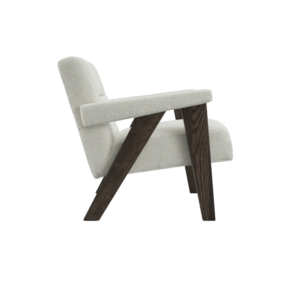 The Abel Chair showcases milk velvet tweed fabric complemented by a warm brown frame. Featuring comfortable padded armrests and a cushioned seat, it is available in two colorways. Perfect as a standalone piece or as a pair around a table.