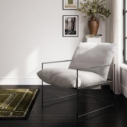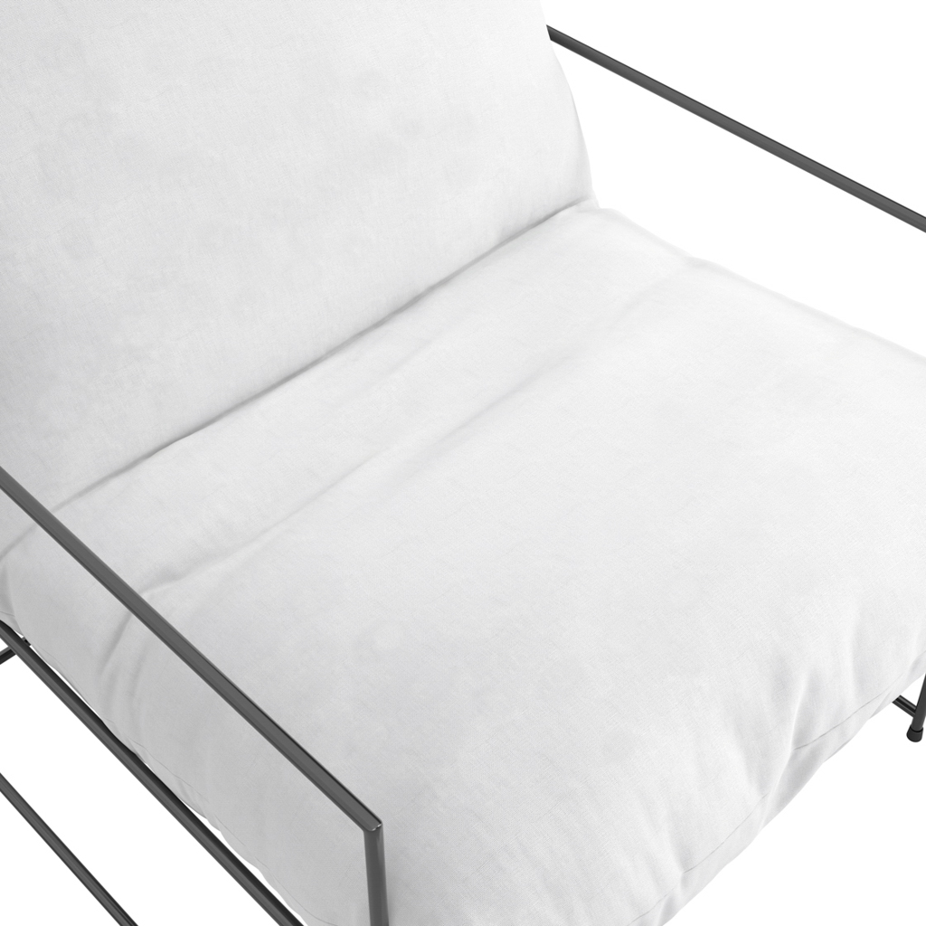 The Brook chair features a matte black metal frame and a cushion-like seat upholstered in Chalk Stripe material. Its relaxed design is perfect for lounging, offering a stylish industrial touch to any space.