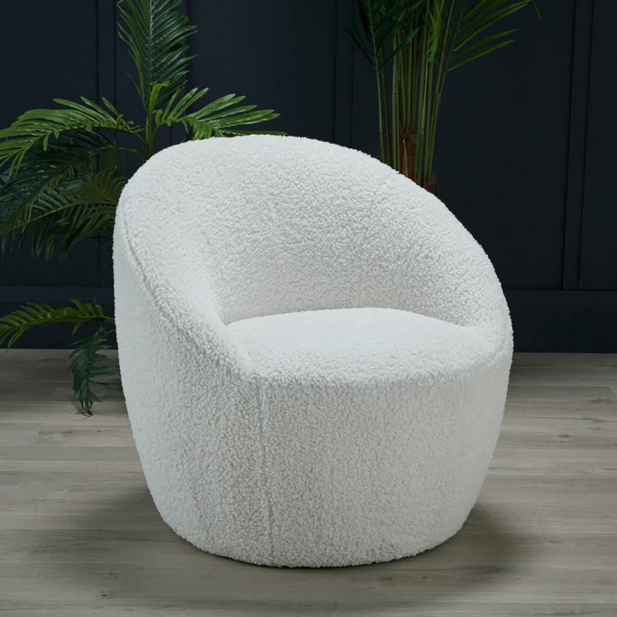 The cocoon chair is exactly what it sounds like… soft, curved and inviting, this chair will keep you snug whilst making a great statement piece in your living space. Available in White shearling fabric.