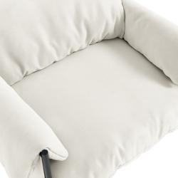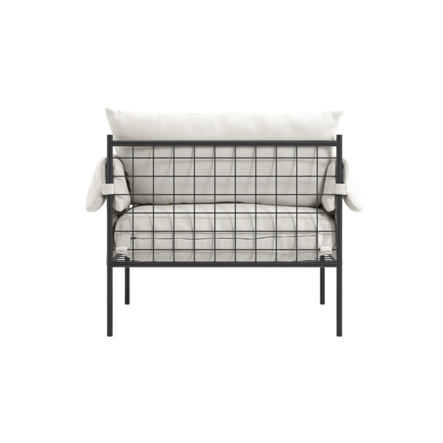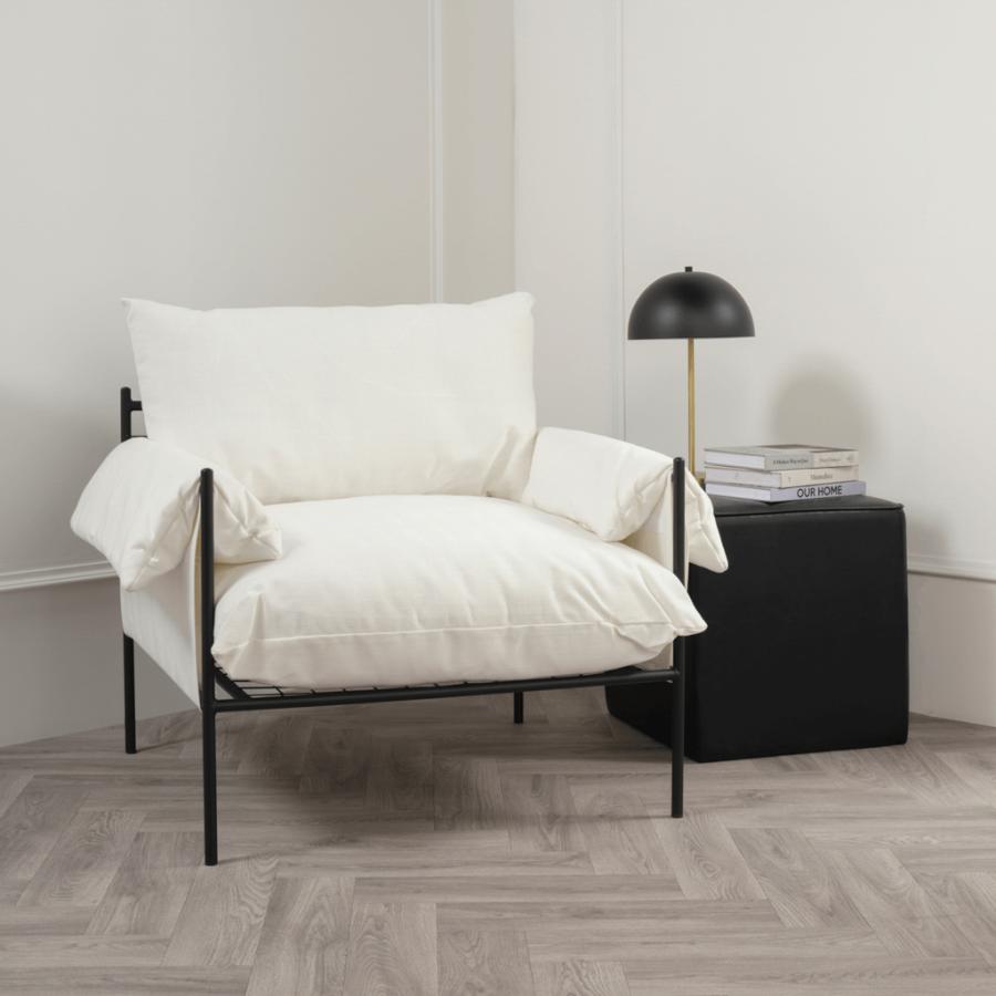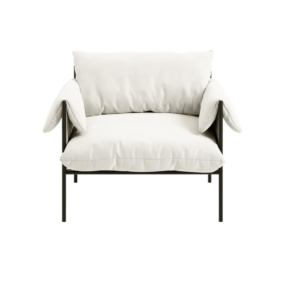 The Wardour chair, upholstered in onyx houseweave fabric, features a matte black powder-coated metal frame. It offers removable arm cushions and plump seat and back cushions for added comfort, all in a sleek modern industrial design.