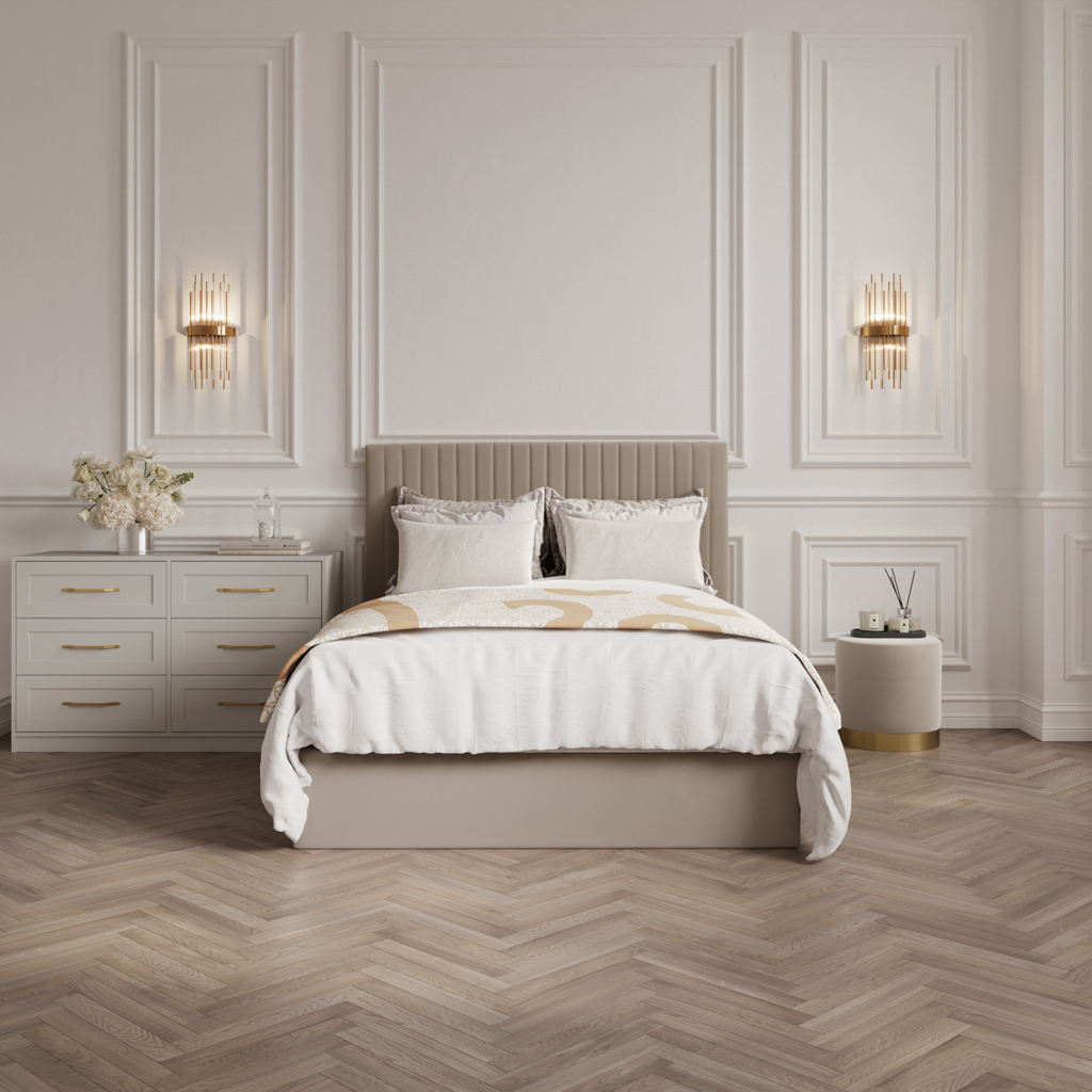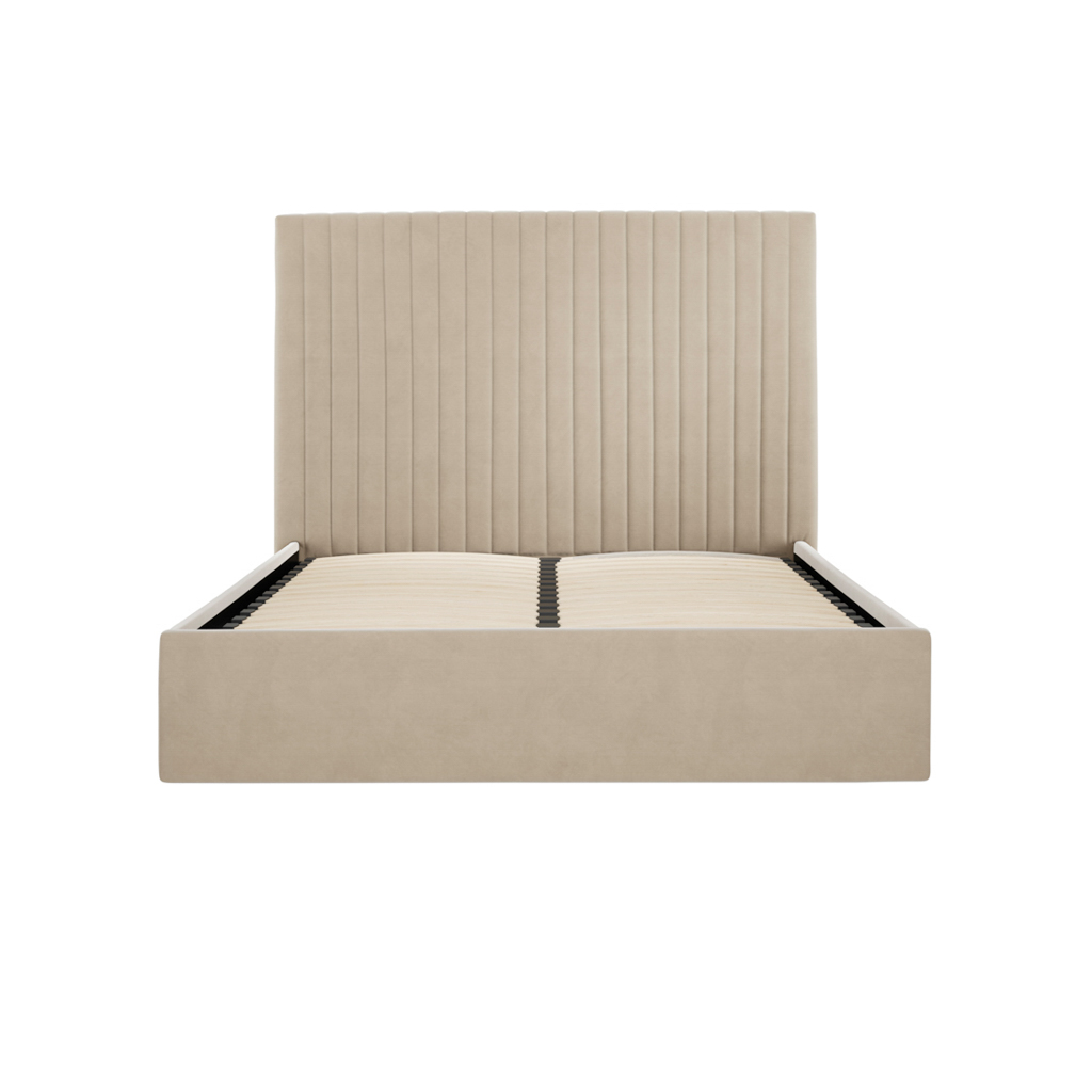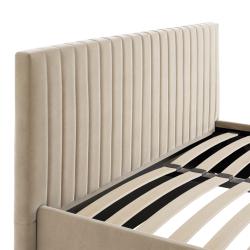 Upholstered in soft beige velvet, this bed offers under-bed storage and a headboard with elegant fluted vertical lines. Available in two headboard heights, its neutral colourway suits any interior. Colours can vary on different screens, and lighting can change how the colour looks in your space