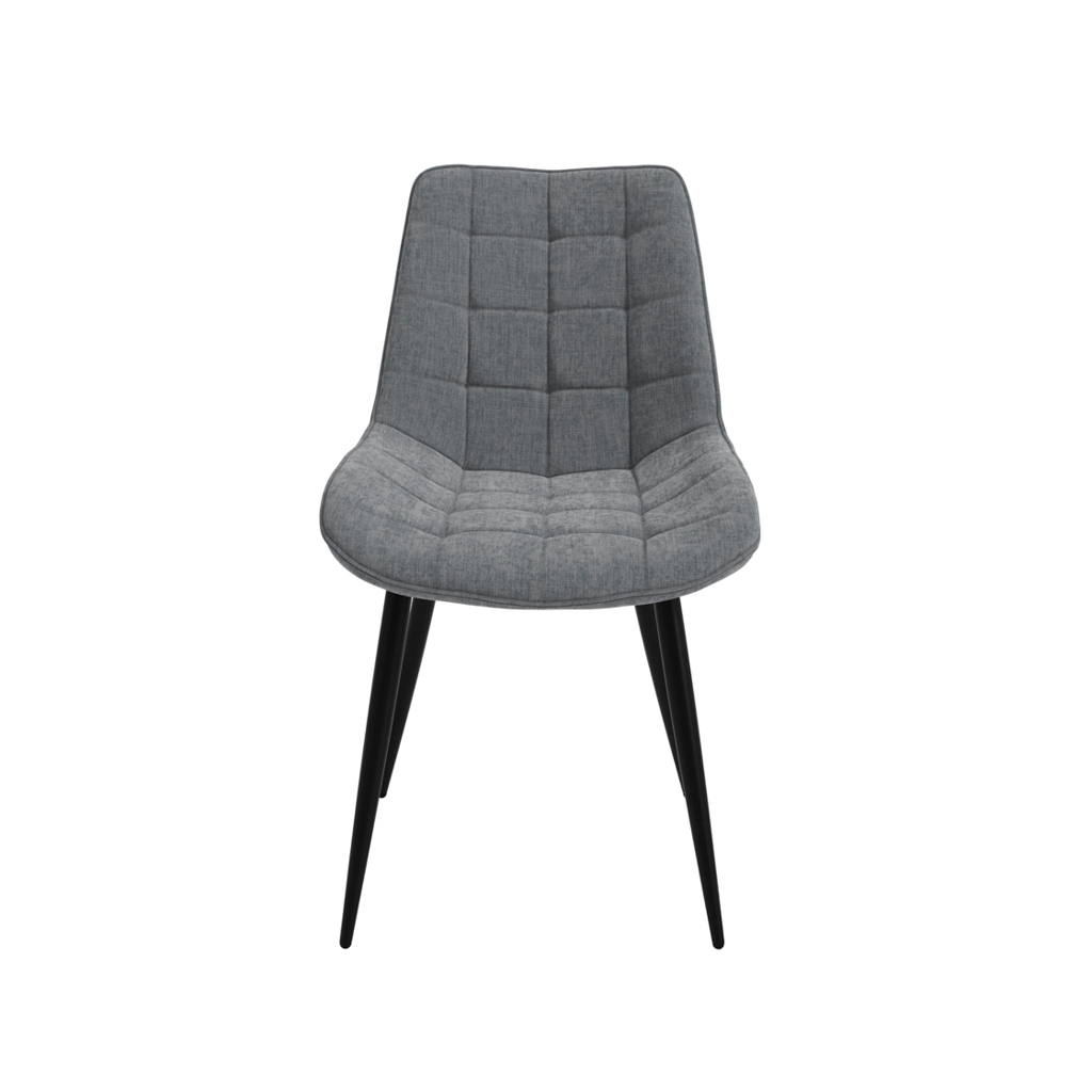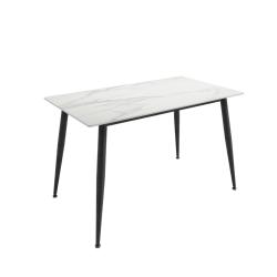 The Luna Dining Set features a sleek white marble-effect ceramic top supported by powder-coated black metal legs, offering a modern and stylish aesthetic. Accompanied by four chairs upholstered in grey chenille fabric, each with a comfortable curved back, this set is perfect for contemporary dining spaces.